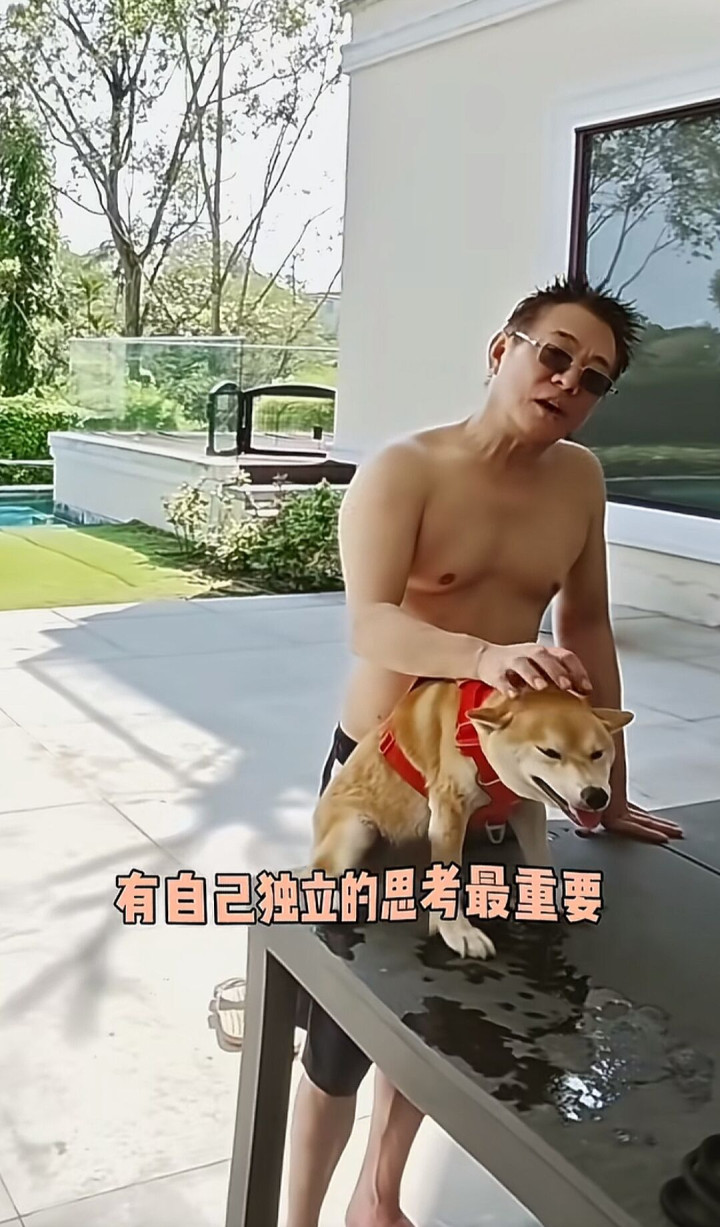 李连杰虽说要游泳,但从他在水里的动作来看,并不专业,仿倒像是只“旱鸭子”。在泳池里稍加扑腾了几下后,李连杰抱着自己的爱犬,对着镜头开始回到了主题。