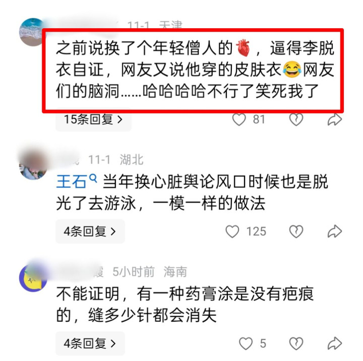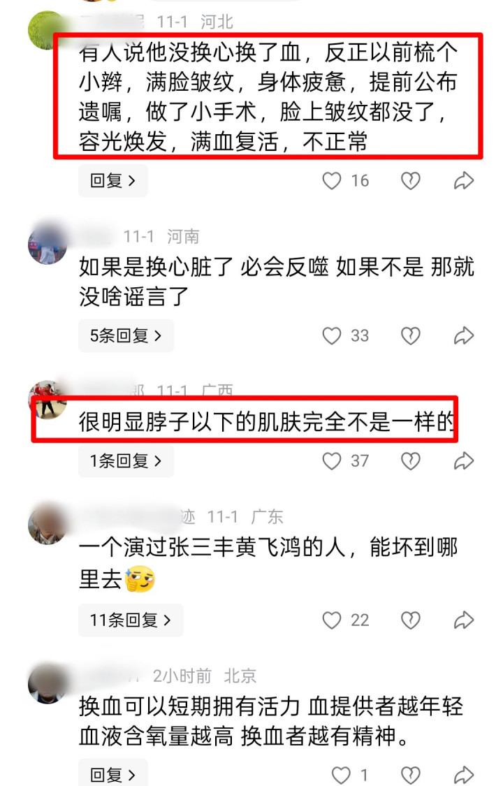 也有网友表示李连杰没换心换了血,给出的理由是这样的:以前梳个小辫,满脸皱纹,身体疲惫,提前公布遗嘱。做了个小手术,脸上皱纹都没了,容光焕发,满血复活,不正常。